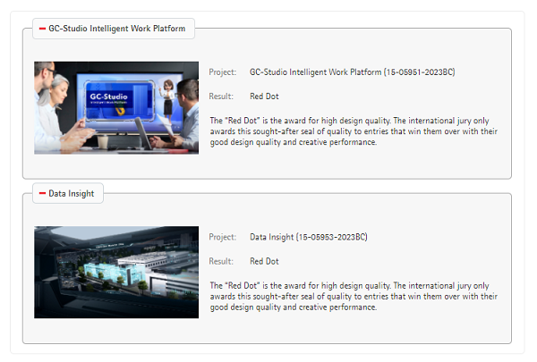 其中,紅點(diǎn)傳達(dá)設(shè)計獎是紅點(diǎn)獎重要分支之一,其全稱為“紅點(diǎn)品牌與視覺傳達(dá)設(shè)計獎”,主要收錄世界優(yōu)秀的視覺藝術(shù)設(shè)計作品。此次獲獎的移動云數(shù)據(jù)可視化DataInsight與GC-Studio智作平臺,不僅有優(yōu)秀的設(shè)計理念、新穎的視覺界面設(shè)計,并且還能夠滿足當(dāng)下各類業(yè)務(wù)場景的數(shù)智化需求。