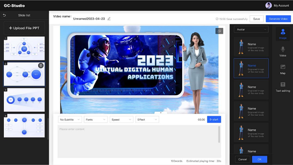 GC-Studio通過最大限度減少傳統(tǒng)視頻制作的人工介入,有效降低使用門檻、提升交互體驗(yàn),大幅節(jié)約了人力資源和物力消耗。企業(yè)只需設(shè)置數(shù)字人參數(shù),即可獲得一個適合公司形象的、專業(yè)的、可24小時無間斷工作的數(shù)字講解員。