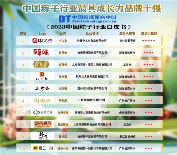 6月14日,中國(guó)數(shù)據(jù)研究中心發(fā)布“2023中國(guó)粽子行業(yè)最具成長(zhǎng)力品牌十強(qiáng)榜”,中之杰躋身榜單第一名,上榜的還有百草味、杏花樓等知名粽子品牌。