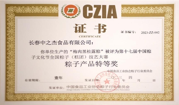 2023年4月19日,中之杰再次驚艷亮相中國(guó)粽子文化節(jié),一舉斬獲三項(xiàng)全國(guó)大獎(jiǎng)。中之杰的梅肉黑松露粽作為創(chuàng)新產(chǎn)品,從原料、工藝、口感、顏值等各個(gè)方面都受到行業(yè)專家推崇,同時(shí)斬獲全國(guó)(糕團(tuán))技藝大賽雙冠王——大賽最高獎(jiǎng)項(xiàng)“粽子產(chǎn)品特等獎(jiǎng)”和“粽子產(chǎn)品創(chuàng)新獎(jiǎng)”,中之杰海鹽芝士炸不爆元宵榮獲全國(guó)(糕團(tuán))技藝大賽最高獎(jiǎng)項(xiàng)“糕團(tuán)產(chǎn)品特等獎(jiǎng)”。