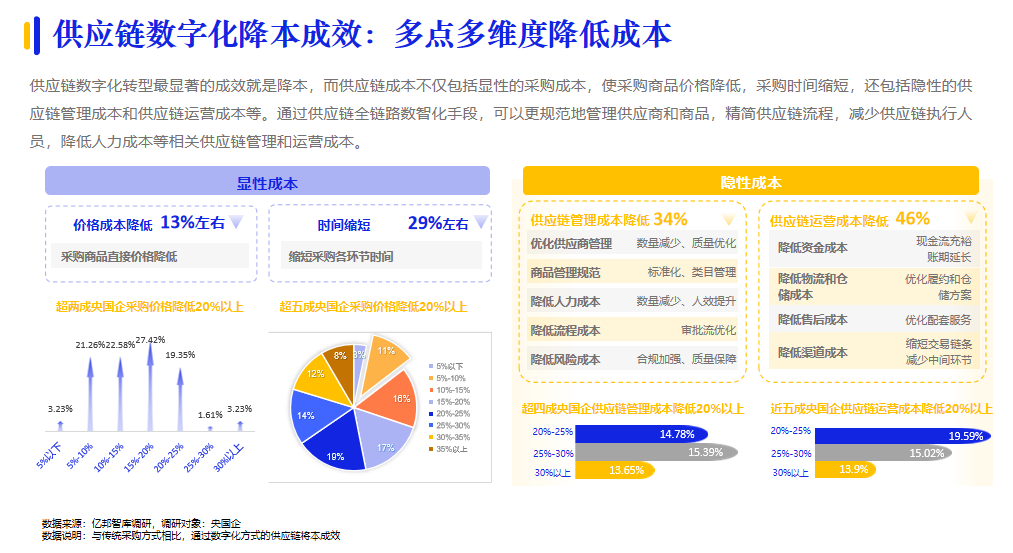 央國企在我國企業(yè)采購數(shù)字化進(jìn)程中的火車頭效應(yīng)越發(fā)明顯。據(jù)億邦智庫調(diào)研,超四成央國企表示數(shù)字化采購滲透率已經(jīng)超過50%;形成了央國企先行,引發(fā)供應(yīng)鏈各環(huán)節(jié)企業(yè)參與數(shù)字化創(chuàng)新變革的發(fā)展態(tài)勢。