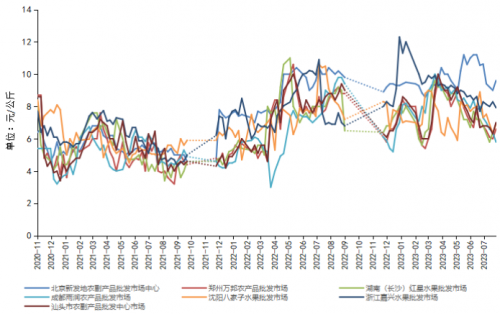 從新華指數(shù)農(nóng)業(yè)市場研究中心重點監(jiān)測的七大批發(fā)市場來看,本期北京新發(fā)地農(nóng)副產(chǎn)品批發(fā)市場中心臍橙批發(fā)均價最高,為9.60元/公斤;成都雨潤農(nóng)產(chǎn)品批發(fā)市場臍橙批發(fā)均價最低,為5.80元/公斤。