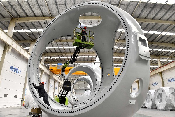 在山東省惠民縣風(fēng)電裝備產(chǎn)業(yè)基地涂裝車間,工作人員對(duì)風(fēng)電輪轂進(jìn)行涂裝。