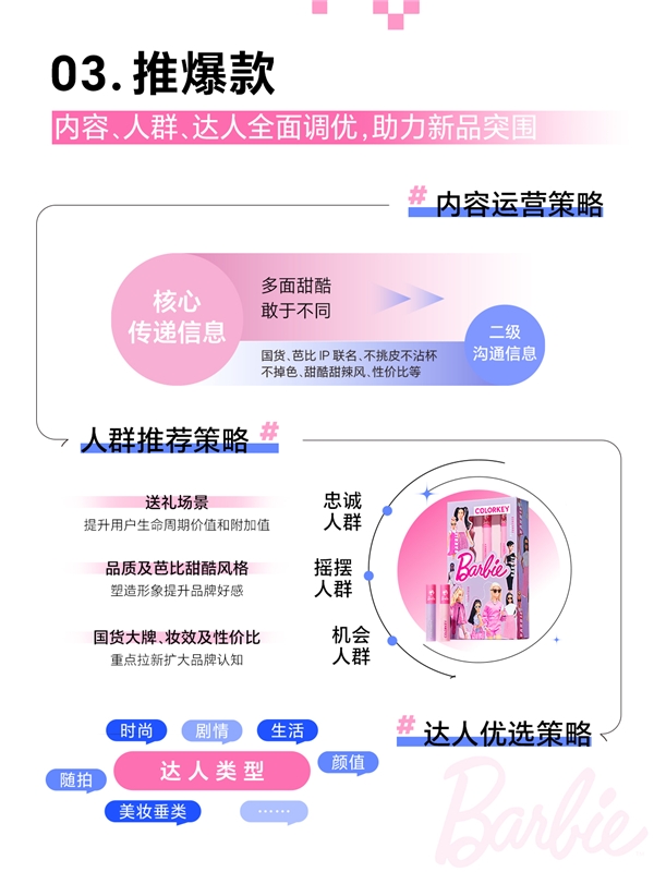 適用于送禮、提升品牌調(diào)性、具有高客單價(jià)特征的“芭比禮盒”新品,符合品牌風(fēng)格特點(diǎn)和消費(fèi)需求,適宜作為品牌形象款進(jìn)行主推和破圈?;诖?珂拉琪打造高客單價(jià)“芭比甜心迷你唇釉出街禮盒”作為618活動(dòng)的主推新品,強(qiáng)力吸引目標(biāo)人群。