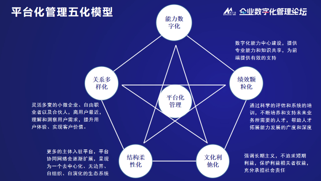 5. 文化利他化:公司文化要強(qiáng)調(diào)堅(jiān)持長期主義,不能追求短期的利益,以保護(hù)利益相關(guān)者的權(quán)益而充分地承擔(dān)社會責(zé)任。平臺化管理的文化是內(nèi)化于心,尤其是外部合伙人要幫助他。