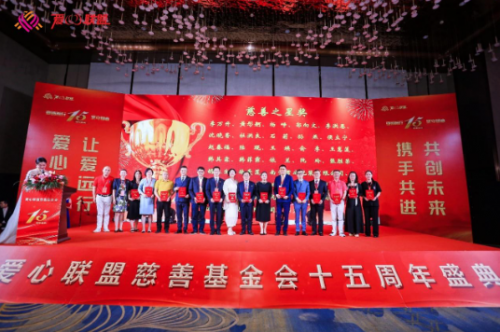 下午,愛(ài)心聯(lián)盟慈善基金會(huì)成立十五周年盛典隆重舉行。全國(guó)勞動(dòng)模范、全國(guó)五一勞動(dòng)獎(jiǎng)?wù)芦@得者、全國(guó)道德模范、吉林省工商聯(lián)副主席、吉林省河南商會(huì)會(huì)長(zhǎng)、愛(ài)心聯(lián)盟慈善基金會(huì)理事長(zhǎng)李萬(wàn)升,河南省政府駐上海辦副主任胡華杰,哈爾濱市政府駐上海辦經(jīng)協(xié)處處長(zhǎng)田磊,中國(guó)浦東干部學(xué)院黨建研究中心主任吳濤,上海中信國(guó)旅總經(jīng)理羅良剛,山東馳恒投資發(fā)展有限公司董事長(zhǎng)王久紅,昆山物流協(xié)會(huì)會(huì)長(zhǎng)孫喜,來(lái)伊份股份有限公司高級(jí)副總裁趙漢利,新希望集團(tuán)草根資本投資部部長(zhǎng)許云龍,上海歐邦醫(yī)療管理有限公司創(chuàng)始人崔海茹,眼界(上海)健康管理有限公司創(chuàng)始人謝攖寧,浙江省有機(jī)產(chǎn)業(yè)協(xié)會(huì)理事長(zhǎng)胡珊,上海妃魚(yú)股份高級(jí)副總裁李財(cái)鋒,愛(ài)心聯(lián)盟慈善基金會(huì)執(zhí)行理事長(zhǎng)楊崢,以及上海市工商聯(lián)直屬商會(huì)和各省市在滬異地商會(huì)秘書(shū)長(zhǎng)等來(lái)自全國(guó)各地的精英和愛(ài)心聯(lián)盟成員300余人歡聚一堂,共同慶祝愛(ài)心聯(lián)盟慈善基金會(huì)成立十五周年。