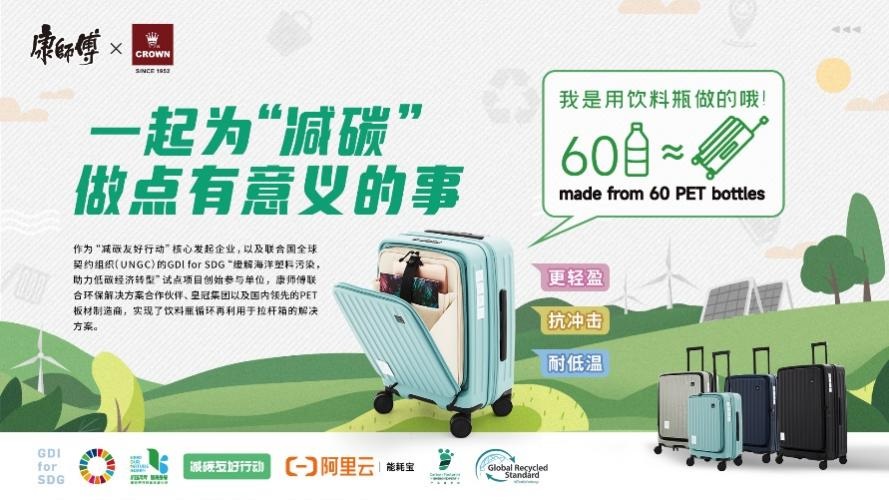 康師傅還作為主要發(fā)起單位之一攜手聯(lián)合國(guó)全球契約組織(UNGC)共同發(fā)起了GDI for SDG(全球發(fā)展倡議助力可持續(xù)發(fā)展目標(biāo))的首個(gè)試點(diǎn)項(xiàng)目——“緩解海洋塑料污染,助力低碳經(jīng)濟(jì)轉(zhuǎn)型”,與合作伙伴一道將回收的PET等使用后塑料制品,再造為多種生活消費(fèi)品,又通過(guò)電商平臺(tái)的銷售推廣,實(shí)現(xiàn)循環(huán)利用。在前不久的世界地球日,康師傅與環(huán)保解決方案合作伙伴共創(chuàng),實(shí)現(xiàn)了用康師傅廢棄飲料瓶制作拉桿箱、野餐墊、收納盒等環(huán)保周邊產(chǎn)品。其中聯(lián)合旅行箱品牌CROWN皇冠,共同推出環(huán)保旅行箱,也是在電商很受追捧,成為第一個(gè)商業(yè)化的rPET項(xiàng)目。由于應(yīng)用了專利技術(shù),旅行箱使用的回收塑料量大,比現(xiàn)有材料更環(huán)保,而且品質(zhì)更好,無(wú)異味,更耐沖擊,耐低溫。這個(gè)項(xiàng)目實(shí)現(xiàn)了從塑料循環(huán)利用到商業(yè)價(jià)值鏈的良性循環(huán),讓業(yè)界看到循環(huán)經(jīng)濟(jì)模式的曙光。