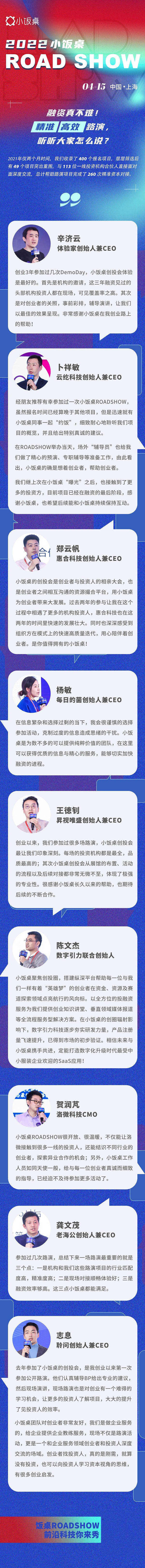導語:4月15日,2022小飯桌ROASHOW將登陸上海,將開設“新能源與新材料”、“企業(yè)服務與工業(yè)科技”、“生物技術(shù)與醫(yī)療健康”賽道專場路演,歡迎各位優(yōu)秀的科技創(chuàng)業(yè)者前來應戰(zhàn)!