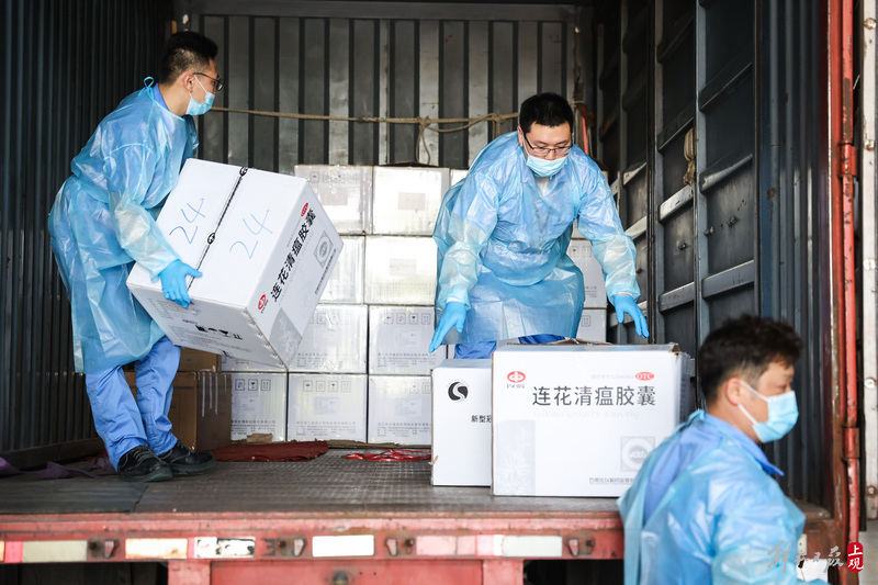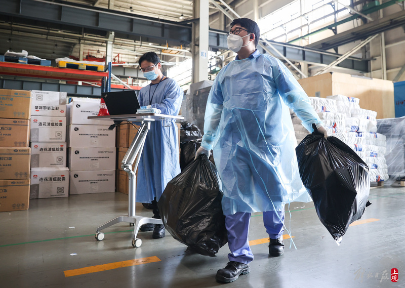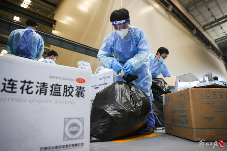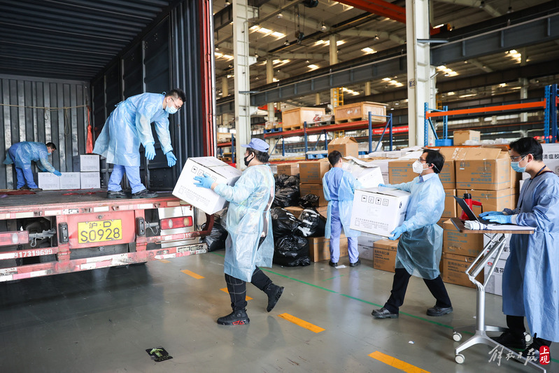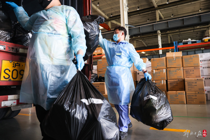 為不增加基層負擔,寶山區(qū)啟用7個分揀點對應13個街鎮(zhèn)園區(qū),由招募來的企業(yè)職工及志愿者流水線作業(yè),對物資開展卸貨、分裝。