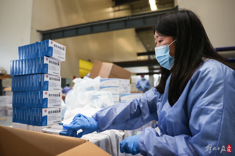 每個服務包內有口罩、連花清瘟膠囊、抗原測試盒,并附有一張上海市疫情防控工作領導小組辦公室的心意卡。