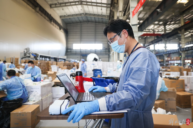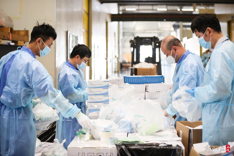 2022年4月11日,上觀新聞記者來到業(yè)績路上的寶山防疫服務包最大的分裝車間,這里原本是上海漢虹精密機械有限公司的生產廠房,但該廠百余名志愿者從早上八點就開始分批次投入到了防疫物資的分裝“流水線”作業(yè)中,一張張清單核對,一件件物資分裝,現(xiàn)場熱火朝天。