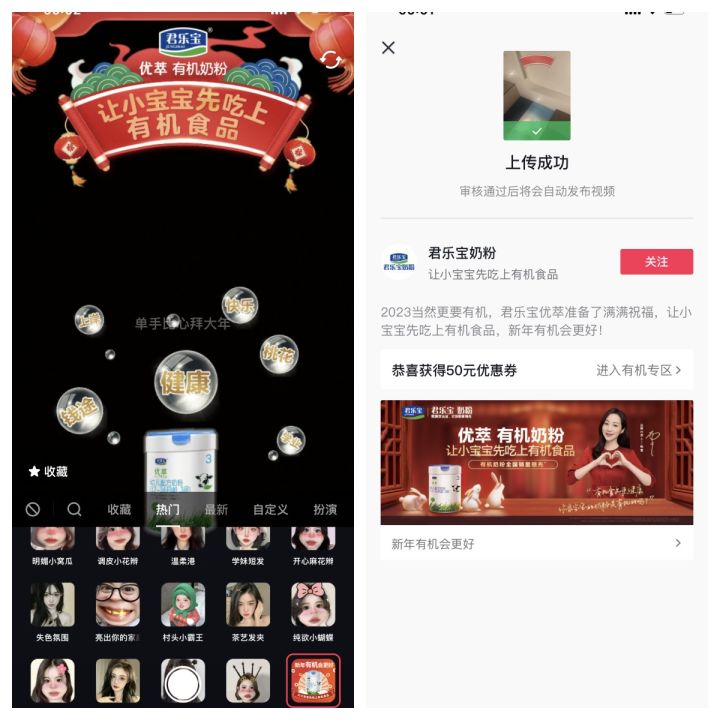 基于新一代母嬰人群所追求沉浸感和參與感,信賴場(chǎng)景式安利、沉浸式感受,因而優(yōu)萃有機(jī)奶粉攜手巨量引擎在基礎(chǔ)品牌信息的純曝光宣傳之外,共創(chuàng)了一系列多元互動(dòng)玩法,如找紅包、集節(jié)氣卡、挑戰(zhàn)賽貼紙等,在點(diǎn)燃新春氛圍的同時(shí)加深了品牌與用戶深度互動(dòng),尤其是在抖音上發(fā)起的 #新年有機(jī)會(huì)更好 的話題挑戰(zhàn)賽,優(yōu)萃有機(jī)奶粉的有機(jī)賣點(diǎn)持續(xù)多次露出,活動(dòng)各頁面上“優(yōu)萃有機(jī)奶粉,讓小寶寶先吃上有機(jī)食品”高度吸睛,最大程度覆蓋了用戶的目光所及之處,高密度投放且集中化曝光使得優(yōu)萃有機(jī)奶粉品牌價(jià)值理念在用戶心智中形成深刻記憶點(diǎn)。