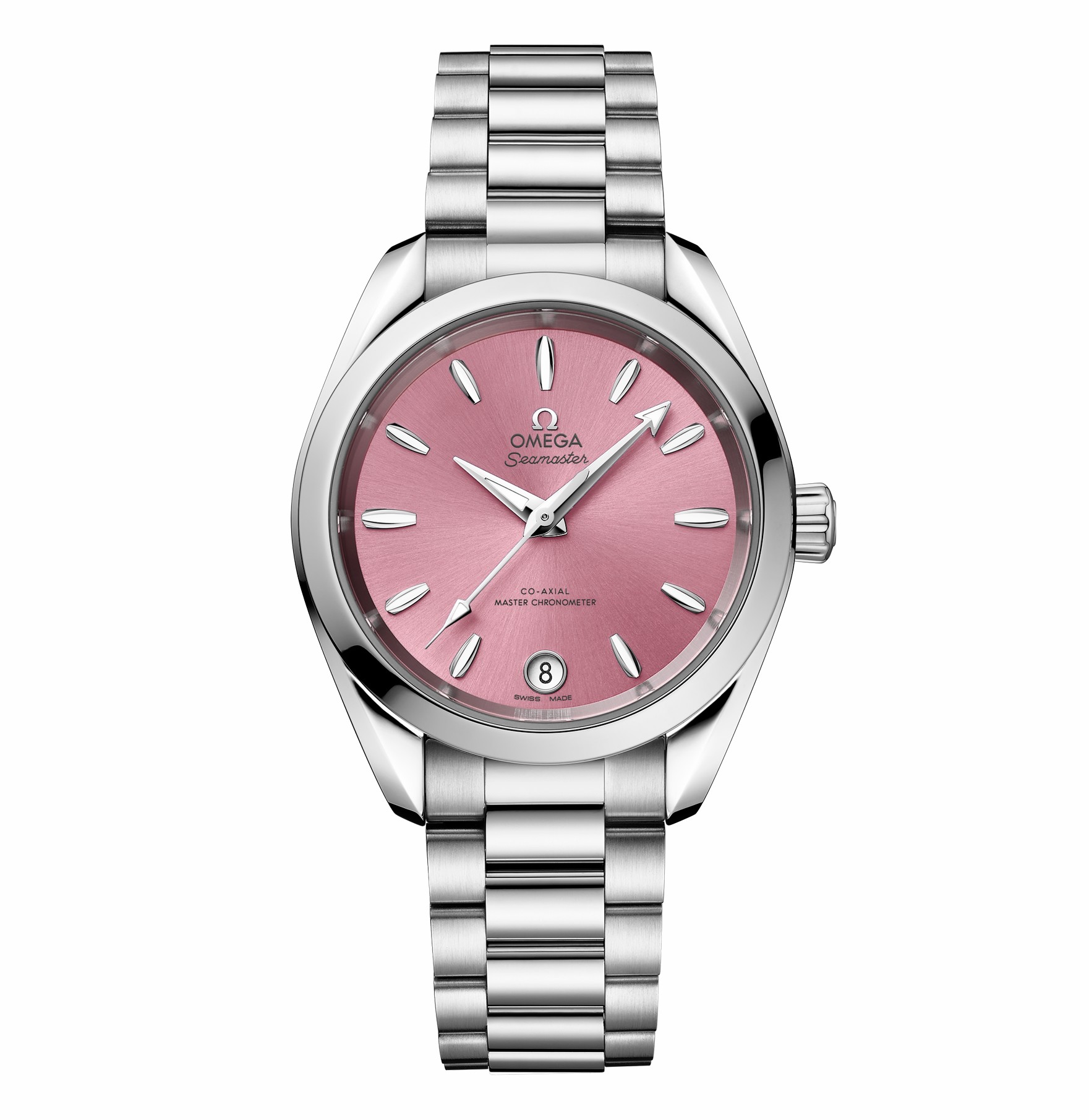 對于女性而言,Aqua Terra 150米34毫米至臻天文臺表或許會更加得心應(yīng)手一點吧。其整體內(nèi)外的設(shè)計基本延續(xù)了36毫米款的特征,變化主要在于盤面的色彩,如貝殼粉色凸顯出其時尚的柔美,而海藍(lán)色表盤則有剛?cè)岵?jì)的味道,兩者都帶有明顯的婉約色彩,可能頗投女性的眼緣吧。此外,其指針、小時刻度和歐米茄品牌標(biāo)識均以拋光白色18K金制成,6點位的日歷窗由硬朗的梯形變成可愛的圓形,無疑強(qiáng)化了其女表的色彩。